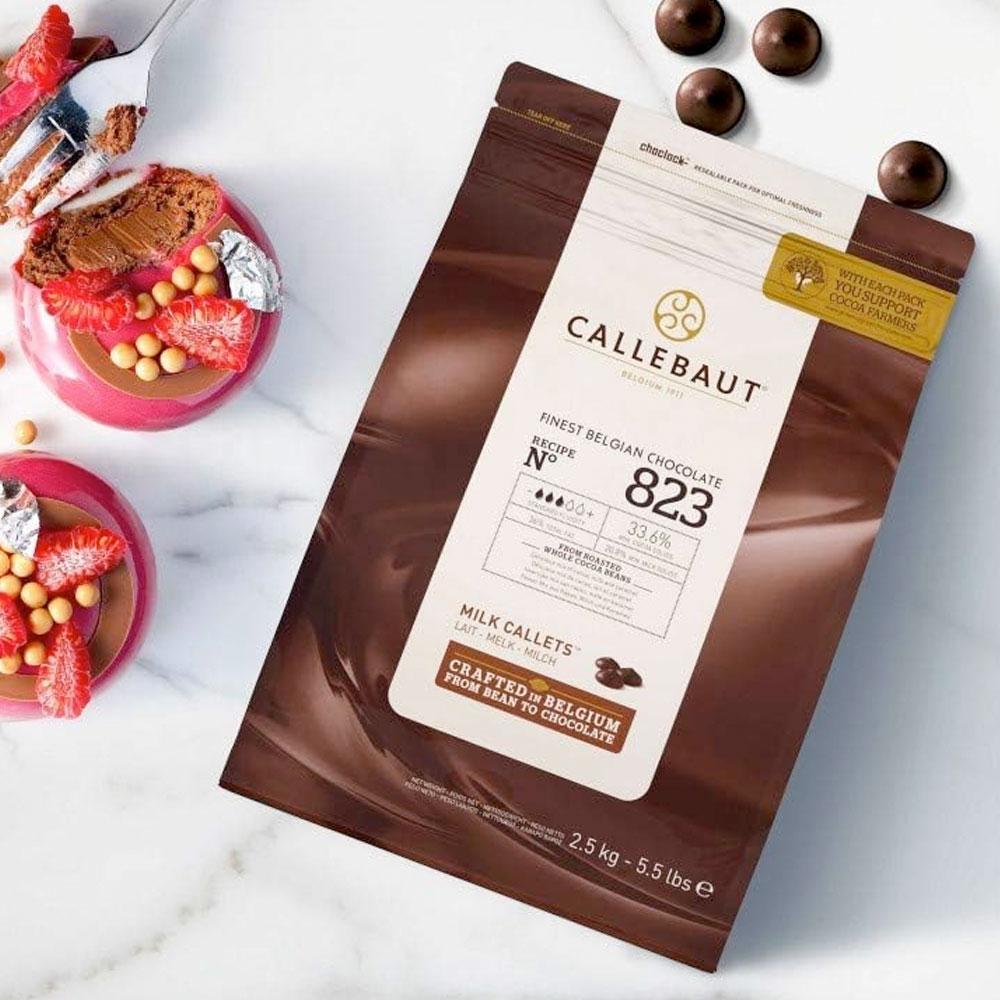 A: Callebaut's Milk Chocolate 823 Recipe is available in a 10kg, 2.5kg, 1kg or 400g bag, or a 5kg block.