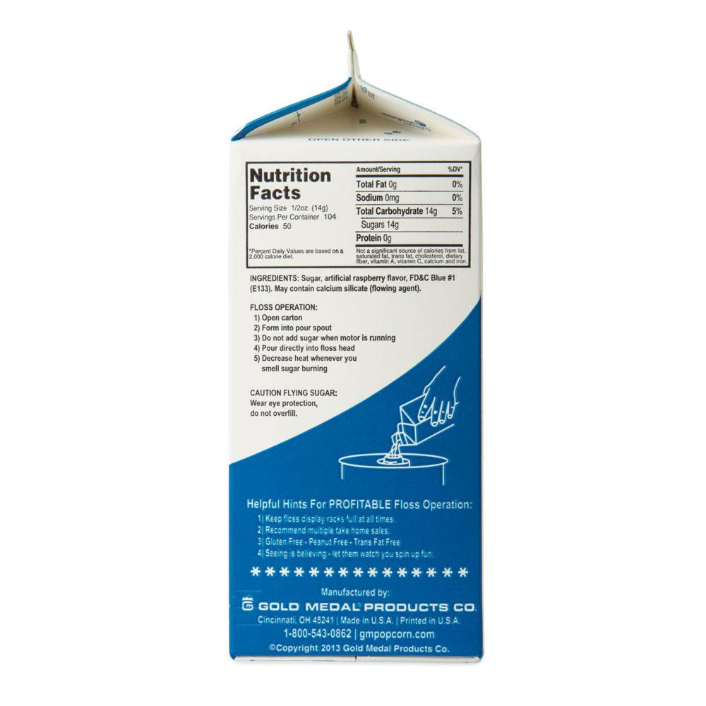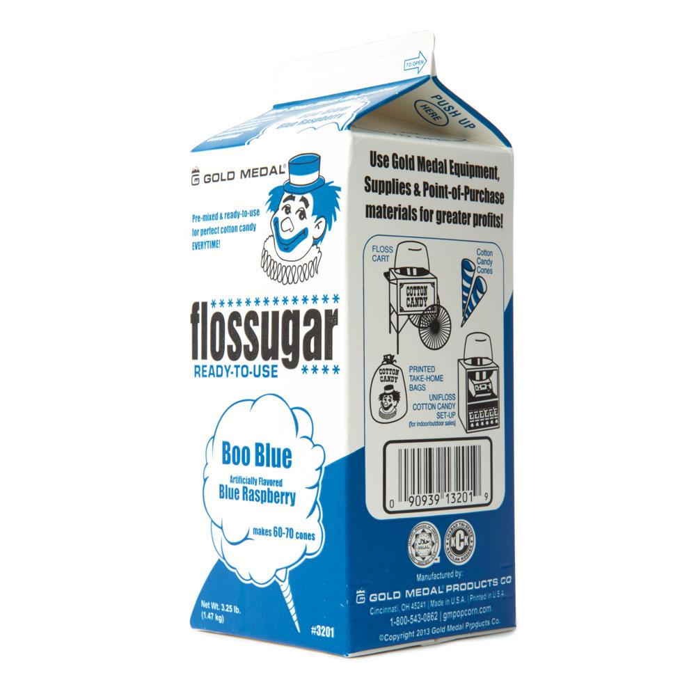 Gold Medal Flossugar Boo Blue is made from a special sugar, not too fine, not too coarse. Colors have been “vividized” so that you get a bright color. It’s packed in sealed 3lb cartons. Open the box and pour into the spinner head - no messy mixing or unsanitary sugar buckets. Inventory is easy and more accurate.