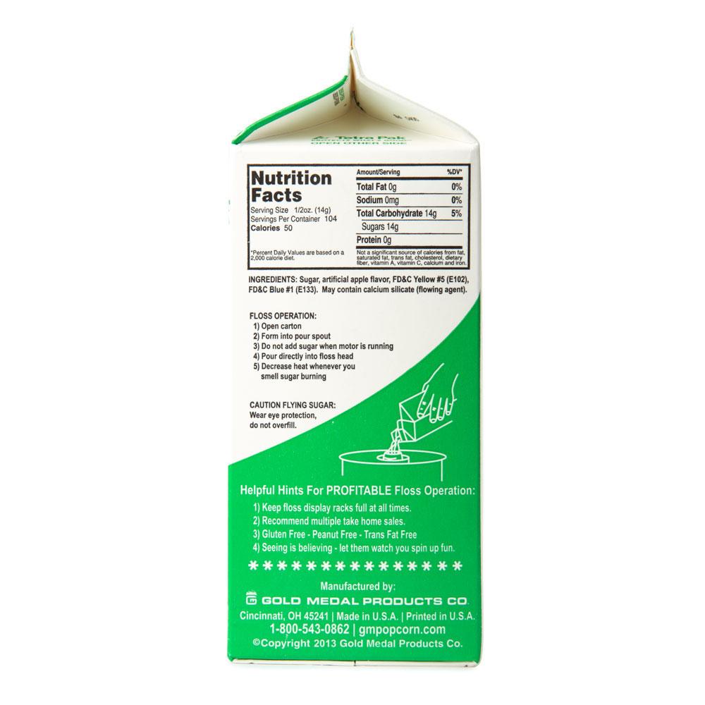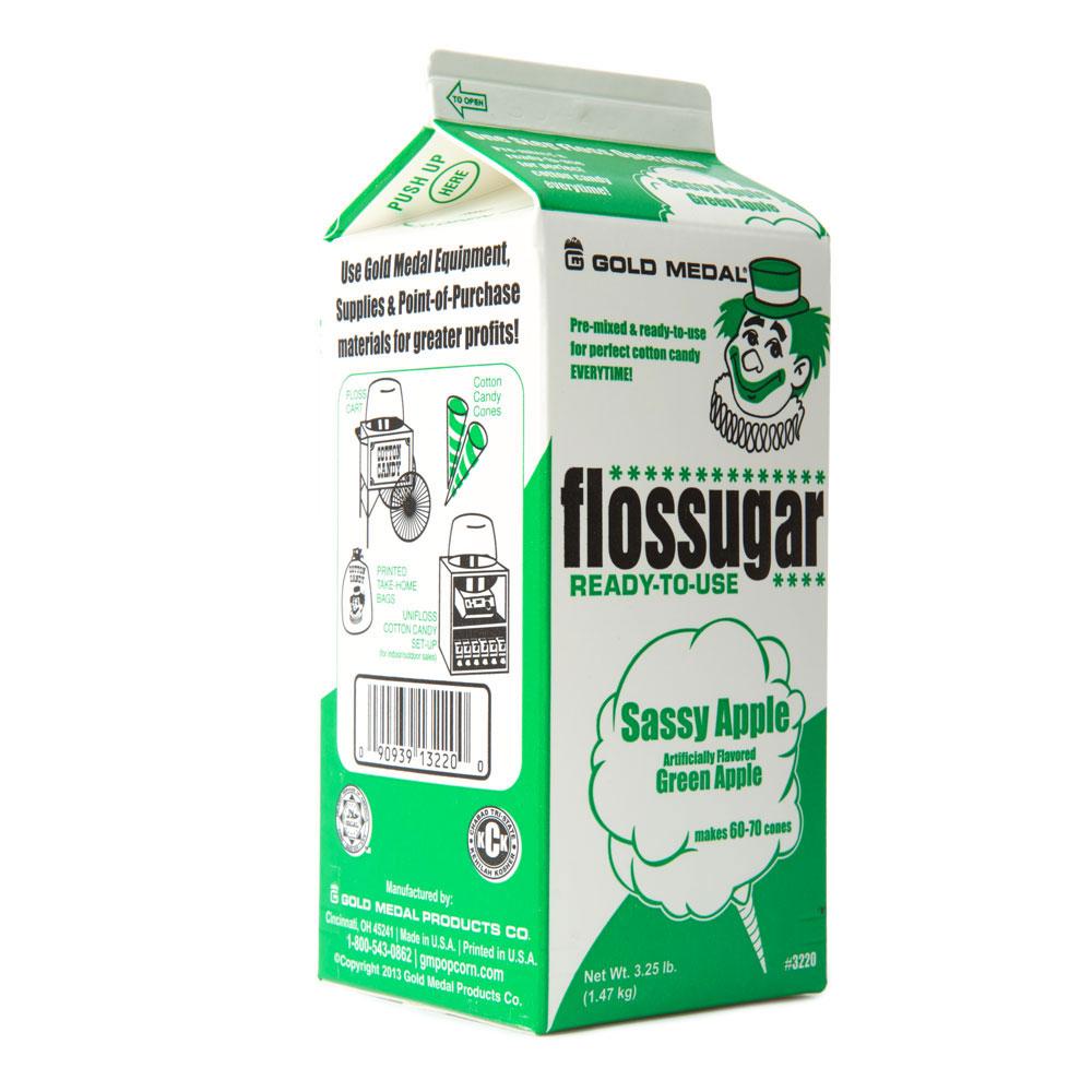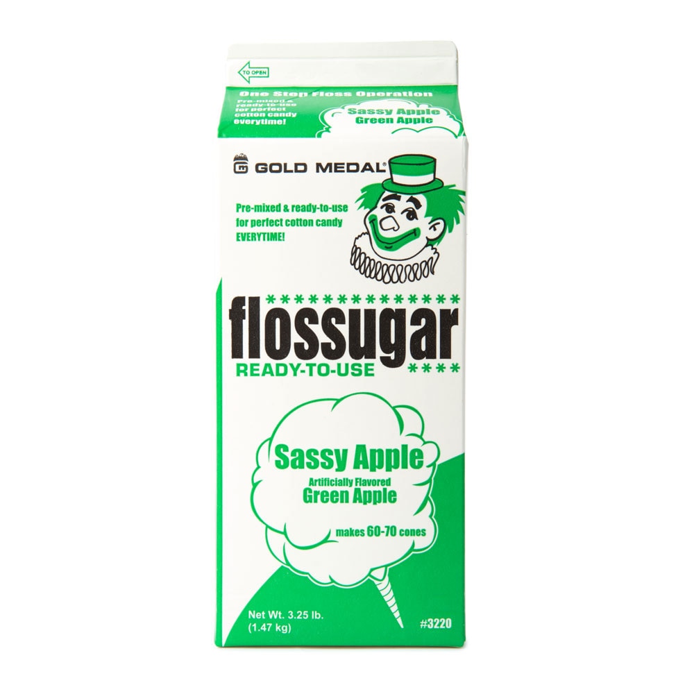 Gold Medal Flossugar Sassy Apple is made from a special sugar, not too fine, not too coarse. Colors have been “vividized” so that you get a bright color. It’s packed in sealed 3lb cartons. Open the box and pour into the spinner head - no messy mixing or unsanitary sugar buckets. Inventory is easy and more accurate.