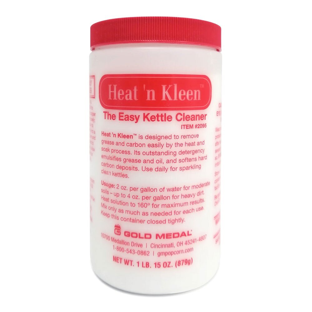 Heat 'n Kleen Popcorn Kettle Cleaner is safe and simple to use. Simply put in a few tablespoons of the product into water and heat within the Popcorn Kettle for great results. Heat 'n Kleen Popcorn Kettle Cleaner softens carbon that builds up within the Popcorn Kettle, making it easy for removal.