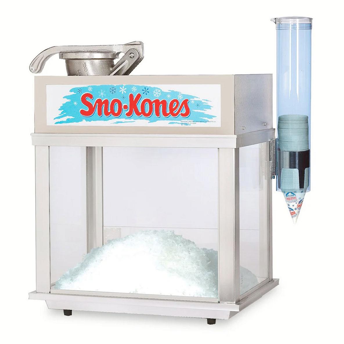 Gold Medal's Sno-Konette cornered the market as the world's first Sno-Kone machine, then took the shave ice industry by storm as the world's first 230V high-speed machine and tempered-glass display case duo. This is truly a shaving powerhouse using a 1/3hp motor to carve out up to 500lbs of ice per hour at 1725RPM. Gold Medal's Sno-Konette includes a cup dispenser, ice scoop, drain pan and #1088 Sno-Kone Dipper.