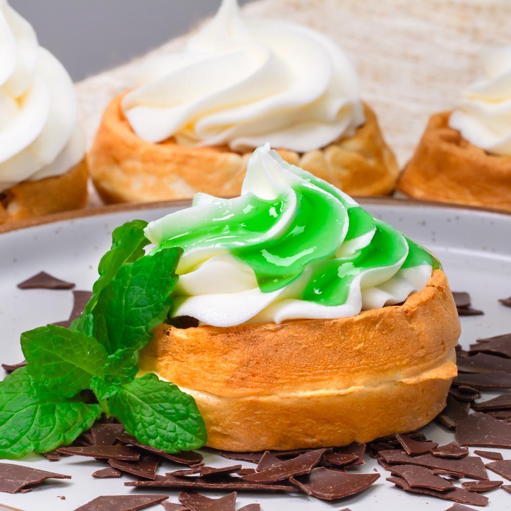 | Pour on waffles or pancakes | Minty Morning Waffle – Warm waffle, crushed biscuits and green mint drizzle |
